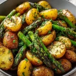 Herbed Garlic Butter Version: Mix some softened butter with crushed garlic and your choice of herbs (like rosemary or thyme). Toss the potatoes and asparagus in this herb butter right before roasting for a richer flavor.